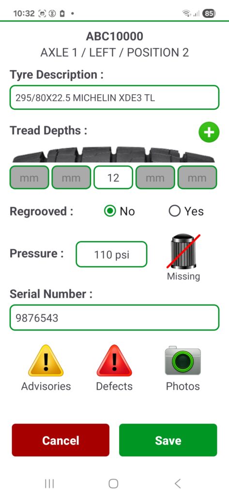 From a single app, fleet operators can perform detailed vehicle inspections directly on their tablets or smartphones. The intuitive interface guides users step-by-step—recording tread depths, pressure readings, and unlimited tyre photos. Defects and advisories can be logged instantly, ensuring roadworthiness and faster issue resolution. All inspection data syncs securely to the cloud for instant access, transparency, and compliance.